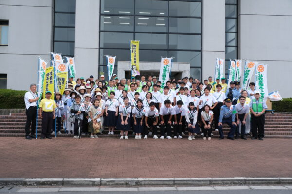令和7年7月24日(木)午後4時 市役所玄関ロビー前に集合し開会式を行いました。滝睦美常陸太田教育長・推進委副員長や奥山仁茨城県太田警察署長の挨拶、長屋篤典保護観察官の紹介の後、全員で記念写真の撮影を行いました。その後、かわねやフェスタ店、カスミ太田店、フォレストモール・ヨークベニマル常陸太田店の駐車場で第75回“社会を明るくする運動”キャンペーンを行いました。久慈地区保護司会常陸太田支部、常陸太田市更生保護女性の会、茨城県太田警察署、市内小中学校長、青少年相談委員協議会、青少年健全育成常陸太田市民の会、太田地区少年警察ボランティア連絡会、里美中学校生徒26名、社会福祉課職員等の方々が参加しました。キャンペーンの参加者約122名で、通行人や来場者にチラシやメモ帳、ティッシュ、ボールペンセットなどを配布し啓発活動を行い、明るい社会づくりを推進しました。